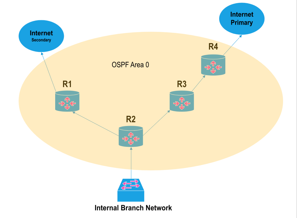 In the diagram above you’ll see a small OSPF area with two exit points to the internet. The business has asked you as the network operator to have the primary route to the internet for the branch via R2 –> R3 –> R4. The secondary or backup internet connection is accessed via R2 –> R1. Lets say all links are equal speed/cost in terms of OSPF metrics and both internet gateways are advertising their respective default quad 0 (0.0.0.0/0) route into the OSPF area. If that’s the case then due to OSPF cost value R2 will install the secondary default route into its forwarding table instead of the primary. An option to direct internet bound traffic to R3/R4 would be to have R1 stop advertising its quad 0 into the OSPF domain, but then R2 doesn’t know about the secondary connection when the link between R2 and R3 fails. A quick way of getting around this issue is by utilizing a floating static route on R2.