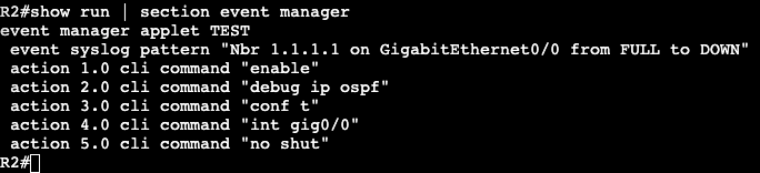 - Often times EEM is used to track specific Syslog messages or interface status’. For example when an OSPF adjacency is lost, an event could be triggered to send an email out debugging. Example below: