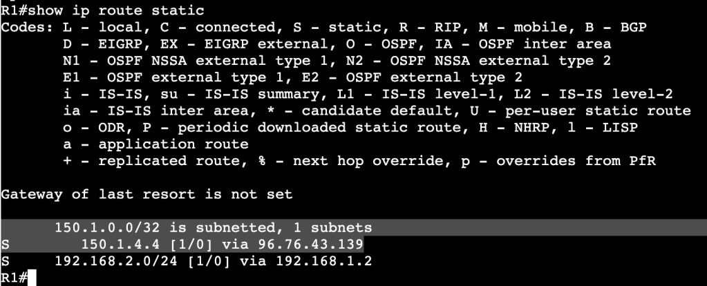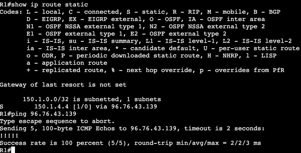 Currently R1’s route table shows the static route is valid and the router can ping R2’s transit interface.