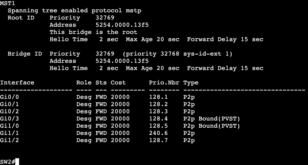 - When running RSTP or PVST alongside MST, a show spanning-tree will provide ‘Bound’ ports.