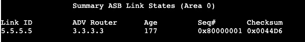 These LSAs can be seen in the OSPF database via ‘Summary Net Link States’ on R5, coming from the ABR, R3.