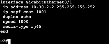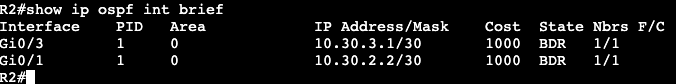 Looking at the OSPF costs of R2’s interfaces shows each with a cost of 1000 due to reference bandwidth set at 1000000.