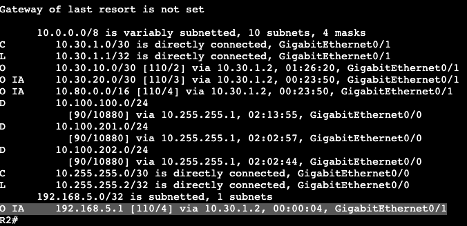 In the image above, R5 and R4 are in area 0, R2, R3 and R4 are in area 146. R5 is advertising the the loopback 192.168.5.1/32, which can be seen as an inter area route in R2.