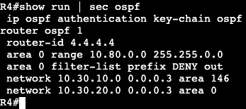 Above shows the prefix list is denying specifically the /32 host route. The next sequence down will permit all other prefixes. This list will then get applied to R4’s router OSPF process configuration.