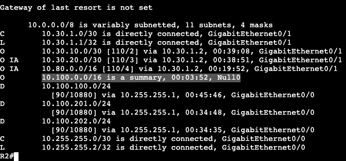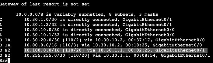 And now on R3 we’re receiving the summary /16 route for external/redistributed prefixes.
