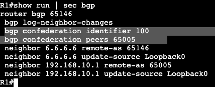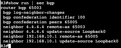R1 is running EBGP (within the confederation) to R5 and iBGP to R6. The confederation configuration is very similar to regular BGP, it just has the two main commands, identifier and peers. The configuration on R3 and R2 are exactly the same except they have different Sub-AS numbers. R3 is below: