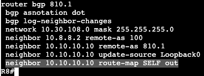 R8 and R10 are in AS810.1, iBGP peers, and R5 is an EBGP peer. R10 receives BGP routes from R5 via R8, but all next hops stay as is, the inbound IP address of 10.8.8.2 from R5. If R5 does not know how to reach that transit link, it will never add routes into its local RIB from R5. This can be changed with ‘next hop self’ in many ways, this is through a route map.
