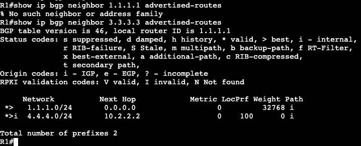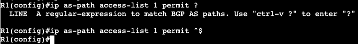 R4 and R1 have two originating routes being advertised into BGP, 4.4.4.0/24 and 1.1.1.0/24. The regular expression ‘^$’ can be used with BGP to show only routes that are originating from the local ASN. This can be used with an access-list/filter list with BGP to only advertise into BGP the locally originated, instead of passing on routes from external ASNs onto additional ASNs.
