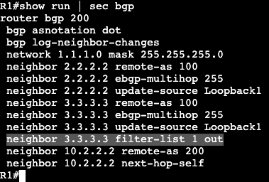 The use of ‘filter-list’ on the neighbor statement then will only advertise out locally originated prefixes through the Regex ‘^$’.