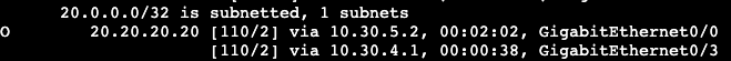 After advertising the loopbacks into OSPF, R1, the router in the middle, now has two destinations to 20.20.20.20/32. R6 and R4.