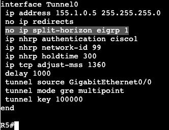 As of right now if a spoke wants to speak to another spoke, it will first have to traverse the hub. This is due to EIGRP changing the next hop value to its tunnel 0 interface. This can be changed with the command below on R5 tun0: