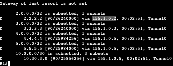Now on R1 when looking at ‘show ip route ospf’ we’ll see the routes for the neighbors come in. On the routes to other DMVPN spokes, we’ll see that the next hop is not modified like it was originally in EIGRP.