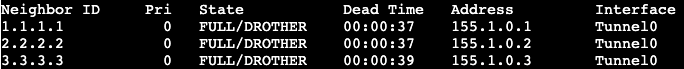 For the spokes on each tunnel and loopback interface we’re going to enable ‘ip ospf 1 area 0’, and on the tunnel interface we will change the network type via ‘ip ospf network broadcast’.