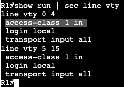 - On R1 we’ll permit who is allowed to telnet/SSH to the box.
