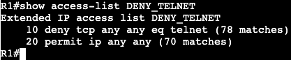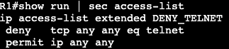 The above will be applied to the interface instead of the VTY lines denying only port 23 from anybody.