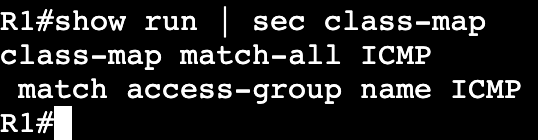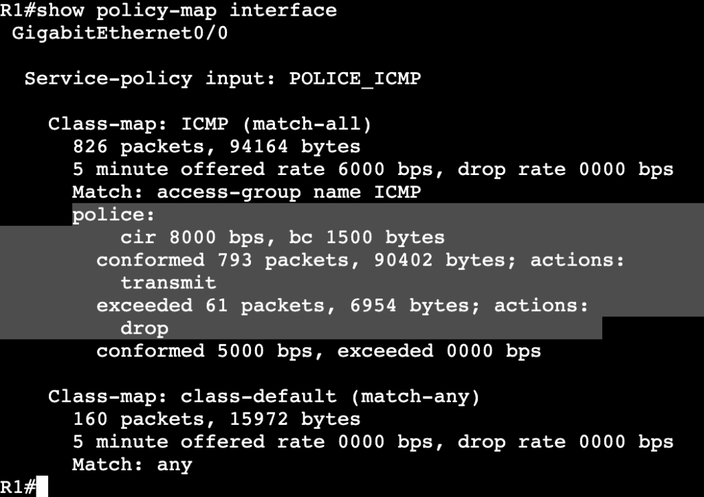 On R1 a ‘show policy-map interface’ shows the conformed and exceeded packets.