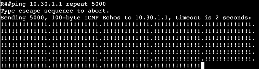 Now on a neighboring router we’re going to send pings to this interface with a high repeat count. On the console of the neighboring router it shows that traffic is being stopped after a certain amount hits.