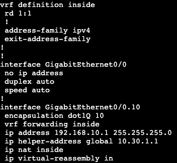 And then we’re creating an overload NAT statement that references our VRF ‘inside’.