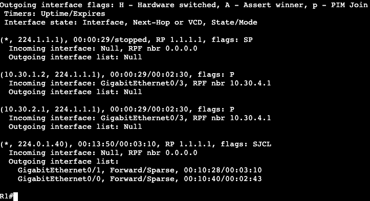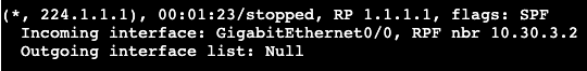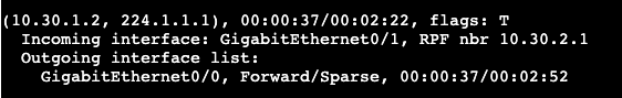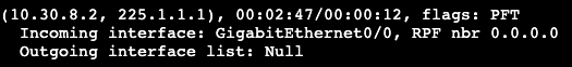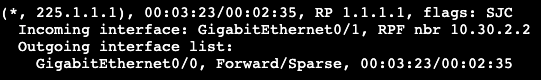 Now the mroute on R10 will show the succeeded RPF check and it will know the path for IGMP group 225.1.1.1.