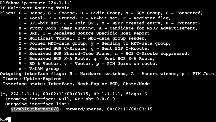 Now, if we head over to R9 and ping the group 225.1.1.1, the RP at R1 will have an (S, G) in its mroute table for 225.1.1.1 with the router I just pinged from.