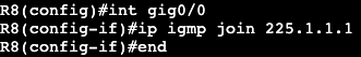To add a group member I will go over to R8, go under the active interface towards the RP, and add an IGMP join message to our newly created Multicast Group.