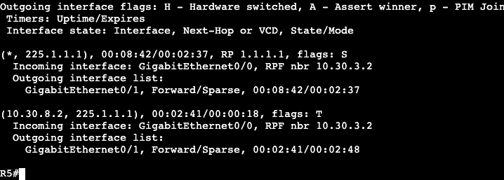 Again from R9 we’ll try pinging the multicast group 225.1.1.1. After we do this, now there’s a group member, there will be a successful ping response. In addition the ‘show ip mroute’ will show the full (S, G) for everything in the path. Here’s R5: