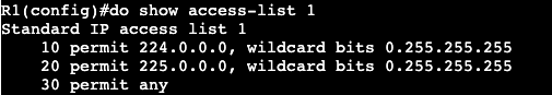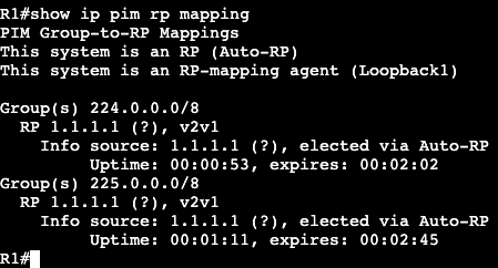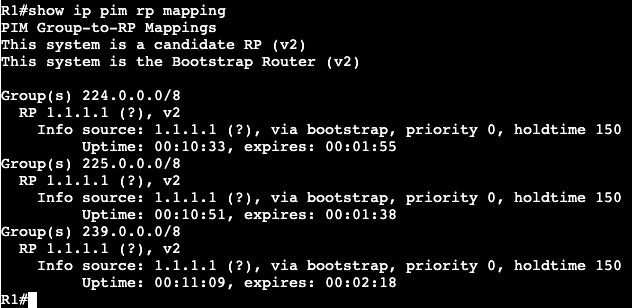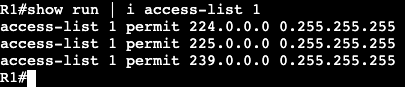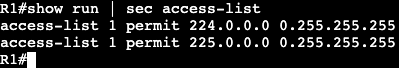 Currently on R1 we can see with the command ‘show ip pim rp mapping’ that we’re servicing the group 224.0.0.0/4. So basically everything. If we wanted to add an access-list to this we could do the follwowing: