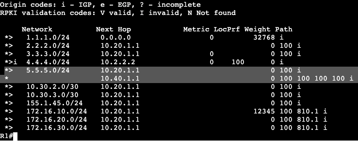 R4 and R1 have two originating routes being advertised into BGP, 4.4.4.0/24 and 1.1.1.0/24. The regular expression ‘^$’ can be used with BGP to show only routes that are originating from the local ASN. This can be used with an access-list/filter list with BGP to only advertise into BGP the locally originated, instead of passing on routes from external ASNs onto additional ASNs.
