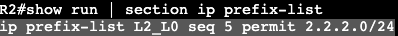 The use of ‘filter-list’ on the neighbor statement then will only advertise out locally originated prefixes through the Regex ‘^$’.
