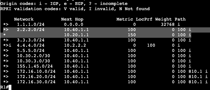 Now on R8’s BGP table, the local ASN prefixes and 1.1.1.0/24 are the only subnets available.